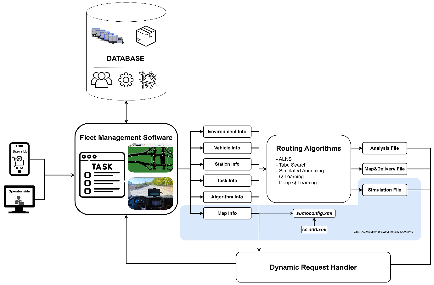 The fleet management system developed in this study has an integrated architecture that combines physical vehicles, simulation environments, route optimization algorithms, and user interface components. The architecture is shown in Figure 1.