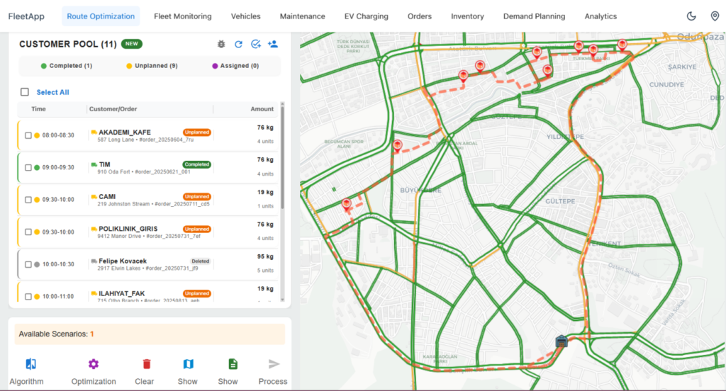 In conclusion, this study presents a flexible and robust framework that integrates route optimization, fleet tracking, and traffic analysis under a single structure. The proposed system enhances the reliability of last-mile delivery services while also improving operational visibility and control. Future research will focus on enriching the system with live traffic feeds, more comprehensive dynamic event management, and broader real-world deployment scenarios, further strengthening its applicability in urban logistics.