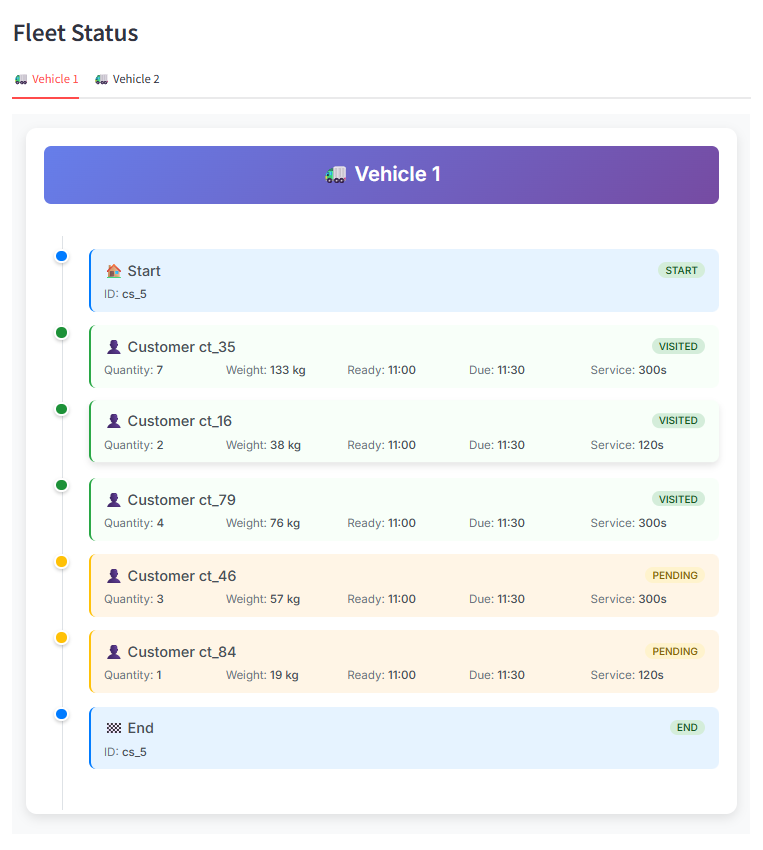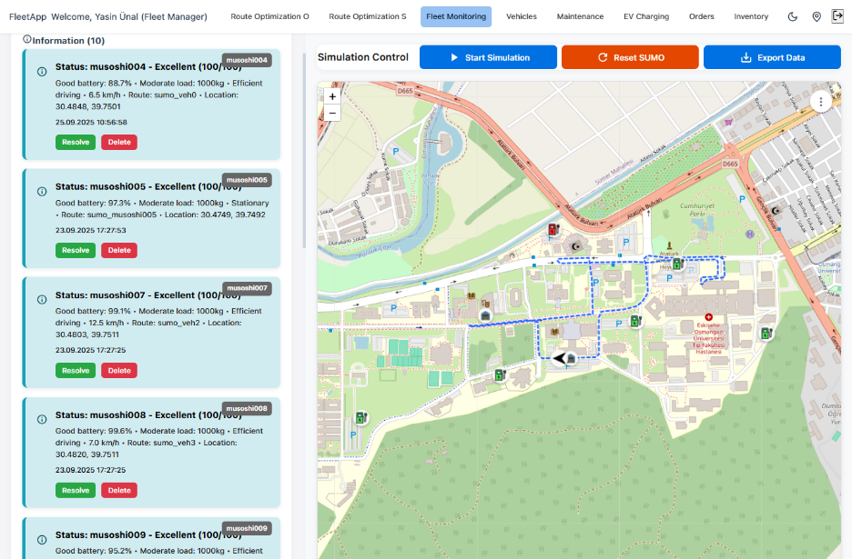 As shown in Figure 2, the Fleet Monitoring Module provides to fleet manager routes for different objective functions such as minimizing total distance, minimizing total energy etc. The fleet manager also monitors each vehicle’s location, speed, battery status, and real-time load on the map. Furthermore, the system’s Maintenance module monitors vehicle periodic service schedules, tire status, and potential malfunctions, maximizing fleet operational efficiency.