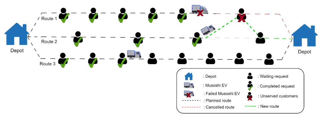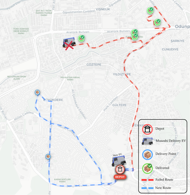 In test Case 2, another EV that is on its way and about to be delivered, assigned the two deliveries of the failed EV in addition to its own route. The two customers assigned to the route are shown on the map as new. The situation ensured that the failure is handled and customer satisfaction is maintained without increasing operational costs by deploying a new vehicle.