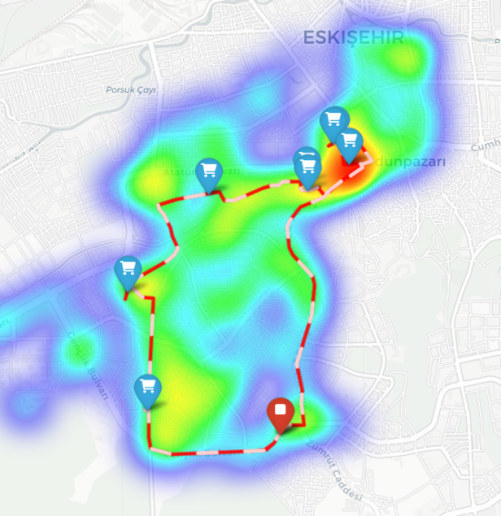 Traffic congestion is known to be one of the most critical external factors directly affecting the efficiency and on-time delivery performance of urban logistics operations. One of the primary objectives of this research is to systematically model and analyze the effects of varying traffic conditions on optimization performance. Real-world data from the Büyükdere neighborhood is used to form a basis for simulation scenarios. The study constructed an idealized baseline scenario, labeled “no traffic” along with two other scenarios representing a range of operational conditions: “off-peak hours” and “peak hours”. A heat map is created for the peak hour scenario to reveal the distribution of traffic congestion along the route. The heat map, presented in Figure 14, shows the critical points and traffic accumulation points along the planned route.