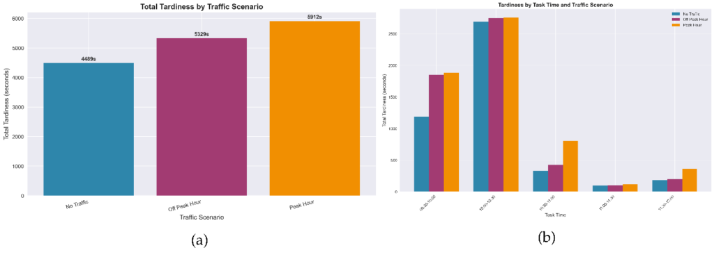 The analysis in Figure 15 reveals that tardiness is clustered both at specific locations and within specific timeframes (Figure 15-b). Dynamic traffic conditions may cause a difference between the planned and actual routes in considering the static plan. To increase the system’s flexibility and efficiency, it is critical that future developments integrate rescheduling strategies based on time windows that account for traffic density at different times of day.