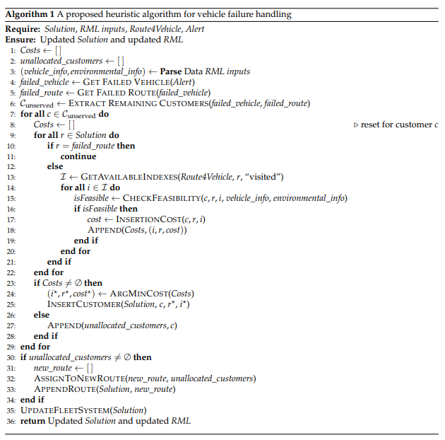 In Algorithm 1, the vehicle failure heuristic uses the proposed data standard and relevant information from the alert to identify the vehicle. Because each vehicle has a route, there are customers whose delivery has not been completed on the failed vehicle’s route. For the customers mentioned, checks are made to assign them to the route plans of other candidate vehicles in distribution, ensuring that load capacity, battery capacity, and time constraints are met. If feasible additions are available, the placement cost is calculated, and additions are made. If no feasible additions are found, a new vehicle departs from the depot, and unserved customers are added to the new route plan.