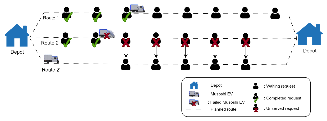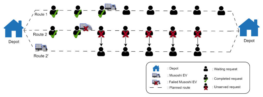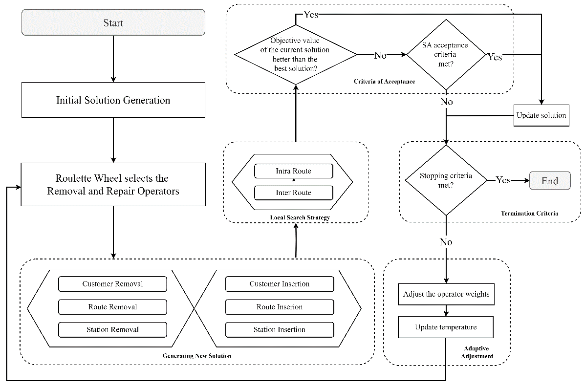 The flowchart of the ALNS algorithm is shown in Figure 3, and the corresponding removal and repair operators are presented in detail in [31, 32]. Obtained solutions are subsequently configured to accommodate unexpected situations such as vehicle failures. The system architecture is designed to respond to dynamic conditions such as vehicle failures, as shown in Figure 4.