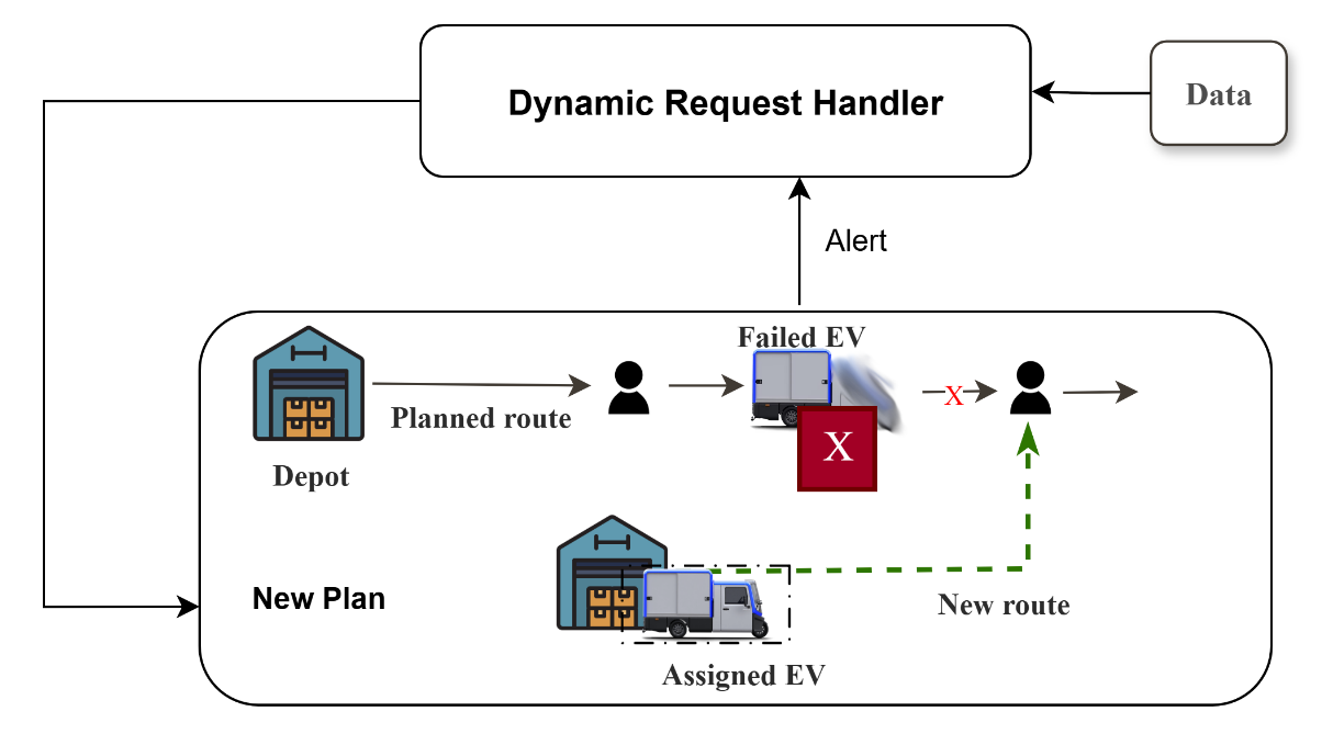 The vehicle executes the static plan generated by the routing optimization algorithm. During execution, an alert is generated regarding a vehicle failure. The Dynamic Request Handler checks whether other vehicles assigned to the route can perform the remaining tasks, taking into account unserved customers. If the assigned vehicles are unable to perform the task, it assigns a new vehicle from the depot to the route.