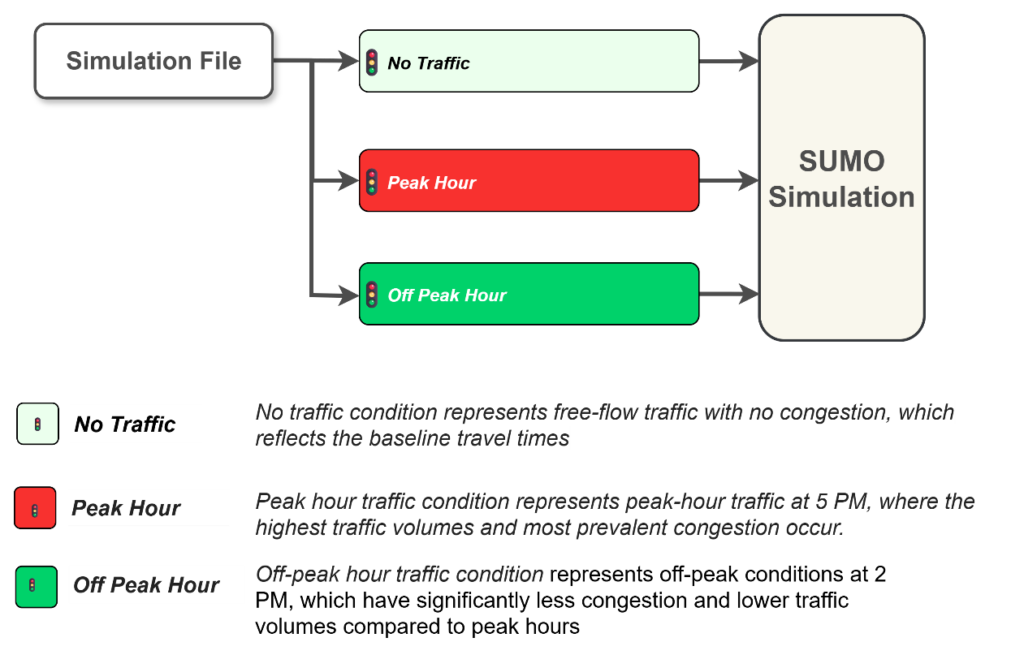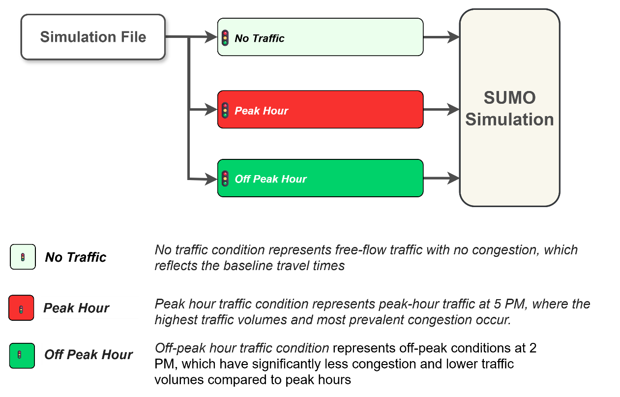 In the simulation environment, only fleet vehicles travel under “No Traffic” conditions, without any interference from background traffic. The condition provides a basis for understanding the theoretical best-case performance in terms of travel time and energy consumption and eliminates external factors. Off-peak hour simulates off-peak traffic conditions at the study site during the 2:00 PM to 3:00 PM timeframe. Lower traffic volumes are expected throughout the network, resulting in little or no congestion, allowing evaluation of route efficiency under relatively favorable urban driving conditions. Peak hour, typically between 5:00 PM and 6:00 PM, models evening peak hour traffic conditions and is characterized by the highest traffic volumes and the time when congestion is most prevalent and severe (Figure 9).
