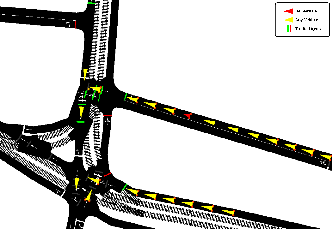 As seen in Figure 9, peak hour traffic is a situation where the traffic is very crowded, and the traffic lights cause an increase in waiting times. Simulating under peak hour conditions is crucial for understanding the impact of heavy traffic on delivery times, vehicle energy consumption (especially for EVs due to frequent stop-and-go movements), and overall operational costs. The three traffic conditions studied are designed to assess the sustainability and robustness of the route optimization strategy under varying urban conditions. The simulation infrastructure integrated into the fleet management system allows for re-evaluation of routes under different traffic levels, enabling route quality to be measured not only theoretically but also in practical terms.