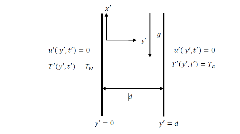 The relevance and importance of free convection flow in vertical plates in medical, science, and engineering have been the center and major inspiration for a considerable number of researchers to continually investigate the natural convection flow with the well-formulated and modeled governing equations in different forms. The applications and usefulness of time-dependent natural convection flow are countless to enlist such including: cooling of nuclear reactor systems, food processing, cooling of electronic systems, pharmaceutical processing, forecasting of weather, designing of medical devices, and others. For many years, the investigation of numerous researchers on time-dependent free convection flow in an upright channel has been repeatedly revealing the imperative of natural convection in science, medical, and engineering, with the strong recommendation to be used owing to its effectiveness and low cost in practice over other modes of heat transfer. A few numbers of investigations, through some competent researchers, on time-dependent natural convection flow in a vertical channel from the launch with different physical conditions under the construction of governing equations that are responsible for the flow of the fluid and heat transfer in the vertical channel are there in the literature [1 – 3]. Singh et al. [4] presented an exemplary result through the investigation of transient free convection flow between the two parallel plates with isothermal boundary conditions. The governing equations for the flow of the fluid and heat transfer were solved exclusively by applying the Laplace transform techniques, and exact solutions were obtained for velocity, temperature, skin friction, mass flux, and steady-state solutions. Their work revealed that an increment in the time \(t\) leads to an increase in velocity and temperature, and an increase in the Prandtl (\(Pr\)) number causes a decline in the movement of the fluid and transfer of the heat in the system.