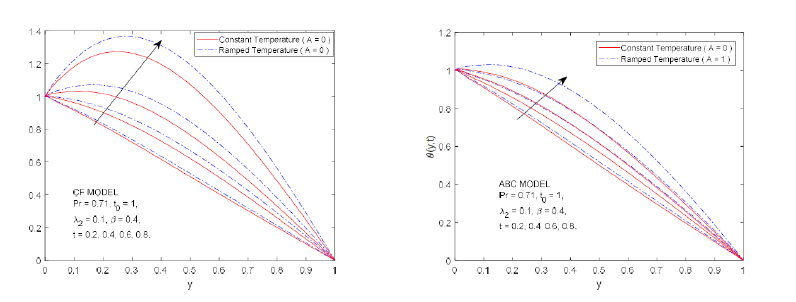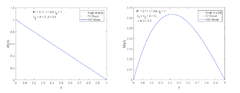 The impact of the fractional time-derivative model of Caputo-Fabrizio (CF) and Atangana-Baleanu in Caputo sense (ABC) and ramped temperature with isothermal boundary conditions on temporary natural convection flow in a vertical plates of separated distance has been investigated. Through the solving of the dimensionless governing equations with the Laplace transform scheme and the reverse of the solutions from the Laplace purview to the time purview, the semi-analytical solutions were obtained. For the numerical tabulation and graphical demonstration, the following numerical values are assigned to the pertinent parameters: \(Pr=0.71\) and \(7.0\), \(\lambda_1=0.1\), \(\lambda_2=0.1\), \(A=1\), \(t_0=1\), \(t=0.6\), \(\beta=0.4\), and \(\alpha=0.4\). Figures 2(a) and (b) demonstrate the uniqueness of the results obtained through the CF and ABC model with Singh et al. [4]. It is confirmed that the temperature and velocity of the present study via CF and ABC are the same as the temperature and velocity of Singh et al. [4] at the preoccupied of \(\lambda_1\), \(\lambda_2\) and \(A\) i.e. \(\lambda_1=0\), \(\lambda_2=0\) and \(A=0\). This established the accuracy of the method used in the present work.