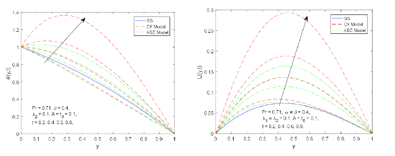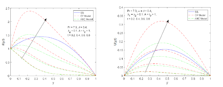 Figures 4(a) and (b) demonstrate the consequence of the increase of time \(t\) on temperature and velocity at \(Pr=7.0\). It is noticed that both velocity and temperature via CF and ABC models increase with the increase in time \(t\) and are observed to be the same at \(t=0.2\). It is observed that the heat generation and the movement of the fluid are incredibly higher when \(t=0.8\). This implies that, at higher time, the delay in temperature has less effect. It is remarked that the value of temperature and velocity through CF model is higher than the ABC model. This shows that ABC model has higher memory than CF model due to the Mittag-Leffler function used in ABC model. The steady state of temperature and velocity by CF and ABC in Figures 4(a) and (b) are noticed at a considerably large value of time \(t\) and match the expression obtained in Eqs. (32),(33).