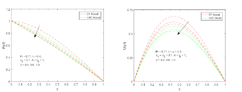 Figures 5(a) and (b) demonstrate the impact of fractional parameter \(\beta\) on temperature and velocity when \(Pr=0.71\). As \(\beta\) increases, it is found that both temperature and velocity decrease regardless of the fractional time-derivative model, CF and ABC. This shows that an increment in the fractional parameter \(\beta\) slows down the generation of the heat and reduces the movement of the fluid. It is observed that the temperature via CF and ABC in Figure 5(a) is the same at \(\beta=1.0\). Since the temperature via CF and ABC is the same at \(\beta=1\), it implies that the obtained result for temperature is related to the classical model of the energy equation. Similarly, it can be seen from Figure 5(b) that the increment of \(\beta\) has a more significant effect on the movement of the fluid at the centre of the channel compared to its effect near the plate at \(y=0\) and \(y=1\).