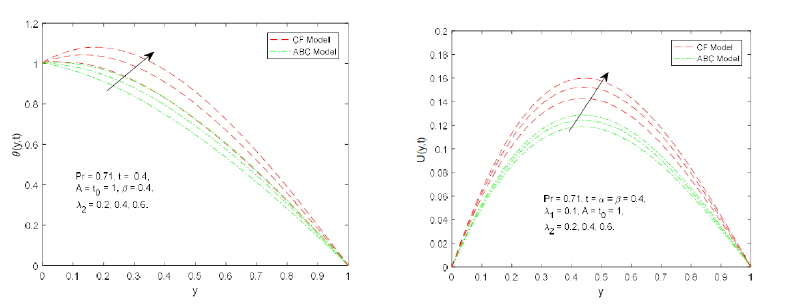 Figures 6(a) and (b) demonstrate the influence of an increment of \(\lambda_2\) on temperature and velocity obtained through the CF and ABC model. It found that both temperature and velocity increase with an increment in \(\lambda_2\). This means that an increment in \(\lambda_2\) enhanced the generation of heat and boosted the movement of the fluid across the system. It is observed that the temperature via CF at \(\lambda_2=0.2\) and temperature via ABC at \(\lambda_2=0.6\) are akin to each other. It means that the spreading of the heat from the heat source to the system is relatively the same through the CF and ABC models at \(\lambda_2=0.2\) and \(\lambda_2=0.6\) respectively. Obviously, it can be seen that the temperature and velocity in the case of CF model are higher than ABC model. It shows that the CF model produces a vast amount of heat and higher movement of the fluid than ABC model with respect to \(\lambda_2\) augmentation.