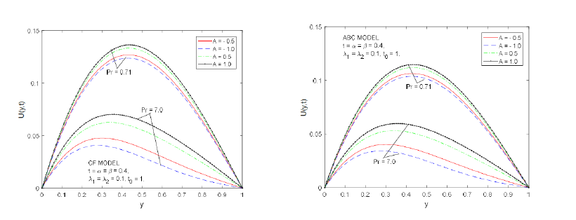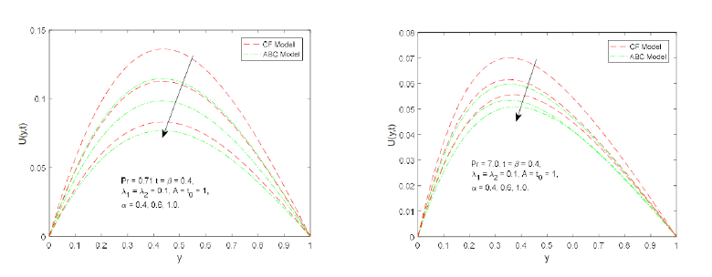 Figures 9(a) and (b) illustrate the effect of \(A\) on velocity acquired via CF and ABC. In both figures, it was found that a negative increment in \(A\) leads to an increase in the velocity of the fluid. It means that the negative augment in the value of \(A\) retard the fluid movement. It is observed that a positive increment of \(A\) resulted in an increase in velocity in both figures. This shows that the positive increase in the value of \(A\) enhances the fluid movement. Also observed in both figures that the velocity through CF is higher than ABC.