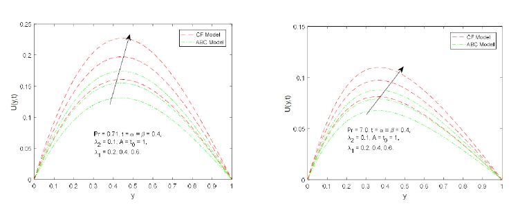 Figures 8(a) and (b) demonstrate the influence of \(\lambda_1\) on velocity achieved through CF and ABC. It is perceived that velocity rises with an increase in \(\lambda_1\). This demonstrates that the augmentation in \(\lambda_1\) enhance and boost the movement of the fluid. Also established that the movement of the fluid through CF model is more swift than ABC model.