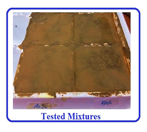 The mix design included ordinary Portland cement, sand, water, the promoter, and a superplasticizing agent. The objective was to determine the highest practical promoter dosage that could enhance the mechanical response of the mortar matrix without adversely affecting mixture preparation or specimen integrity. All mixes were prepared at a constant water/cement ratio of 0.35, while the superplasticizer dosage was fixed at 2% by weight of cement to maintain workable consistency. The dry constituents were first blended thoroughly, after which the mixing water was added and the batch was remixed manually to obtain a uniform paste. Seven mortar mixtures were investigated, comprising one control mixture and six promoter dosages from 5% to 100%. The mix proportions are listed in Table 3, and representative images of the tested mixtures are given in Figure 2. For each mixture, prismatic specimens with dimensions of 20 × 20 × 25 mm were cast for the loading tests.