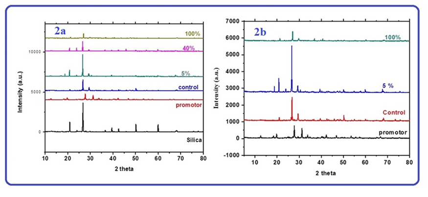 X-ray diffraction was used to identify the principal crystalline phases present in the hardened cementitious composites [23– 25]. The main reflections observed at 2\(\theta\) values of 26.2, 29.39, 32.5, 36, 39.47, 42.46, 50.5, 54.8, 59.97, 67.74, 73.45, and 75.6 (Figure 4) correspond to the dominant fingerprint peaks of the control and promoter-containing samples. The overall diffraction behavior is consistent with the phase assemblages reported by Mollah et al. [24, 25].