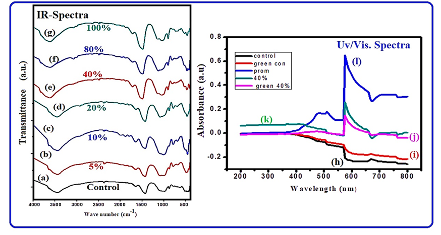 Figure 5(h-l) presents the UV/Vis. response of the control mortar, green control sample, 40% green sample, 40% mortar sample, and the promoter. The 40%-containing samples show a spectral profile closer to that of the promoter, including a pronounced absorption feature near 575 nm, whereas the promoter itself exhibits a broader hump around 485 nm. These observations support the interaction of the additive with the cementitious matrix and are broadly consistent with previous reports on modified cement systems [2, 3, 20].