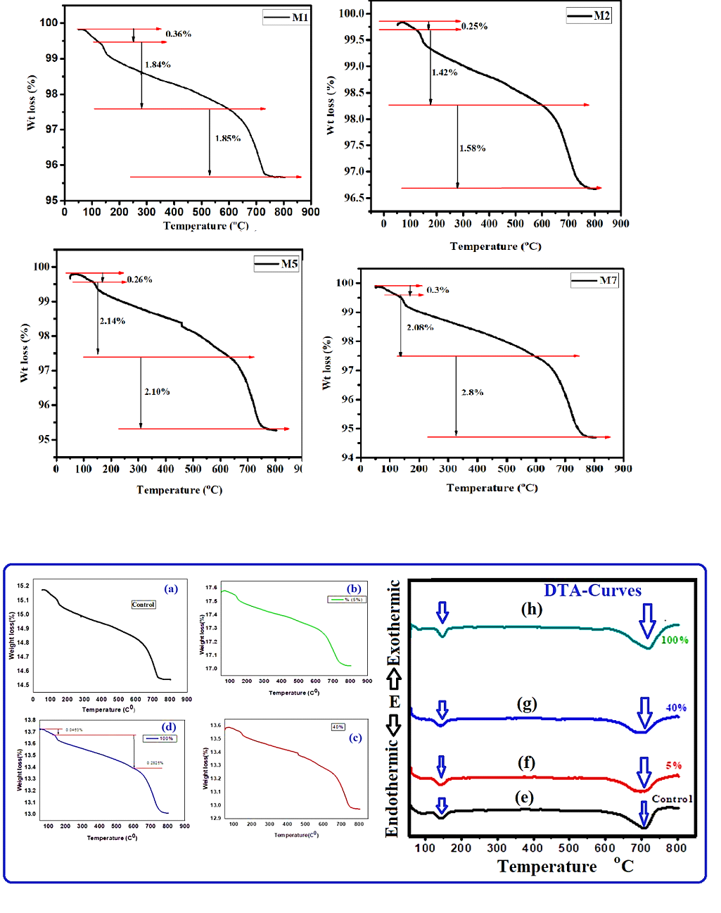 The DTA curves in Figure 6(e-h) exhibit three principal endothermic features. The first occurs below 100\(^o\)C and is mainly related to moisture loss. Endothermic effects between about 100 and 200\(^o\)C are associated with dehydration of hydration products including C–S–H. A higher-temperature endothermic event near 700\(^o\)C is attributed to carbonation-related decomposition and CaCO\(_3\) breakdown [2, 29].