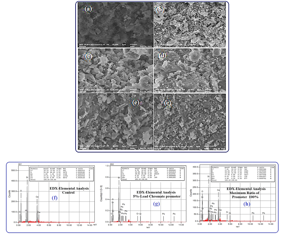 In addition, previous studies have shown that the relative concentrations of lead and chromate ions can influence PbCrO\(_4\) particle formation and growth [15, 16, 33]. In the present composites, the samples in Figure 7(c-e) appear more homogeneous than the control in Figure 7(a), indicating that the promoter contributes to a denser interfacial texture and improved bonding between the cement matrix and the dispersed phase [31].