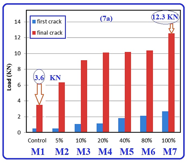 Standard deviation bars are included in the plots to indicate the repeatability of the measurements. Within the investigated range, the load-bearing capacity increased progressively with promoter dosage. Figure 9 shows that the maximum ultimate load was 12.3 kN for M7, whereas the minimum value was 3.6 kN for the control mix M1 [15, 16]. The maximum first-crack load was 2.3 kN for M7, while the minimum first-crack load was 0.2 kN for M1 and M2.
