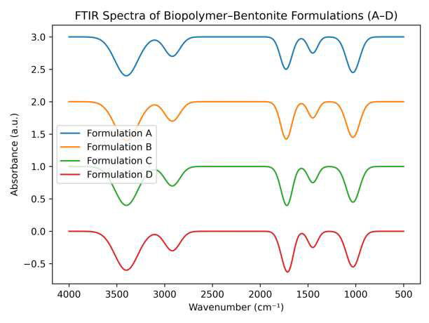 FTIR spectra of biopolymer–bentonite coatings (A–D) as shown in Figure 1. FTIR analysis confirmed the formation of a hydrogen-bonded hybrid network between starch, lignin, and nano-bentonite. Key absorption bands were observed at \(\sim\)3400 cm\(^{-1}\) (O–H stretching), \(\sim\)2920 cm\(^{-1}\) (C–H stretching of the polymer backbone), \(\sim\)1725–1730 cm\(^{-1}\) (C=O stretching from borate crosslinking and thermal treatment), \(\sim\)1620 cm\(^{-1}\) (aromatic C=C vibrations from lignin), and \(\sim\)1030 cm\(^{-1}\) (Si–O–Si/C–O vibrations of bentonite) [18, 19]. The shift of the O–H stretching band from 3405 cm\(^{-1}\) in pure starch to 3378 cm\(^{-1}\) in the composite indicates strong intermolecular hydrogen bonding, enhancing interfacial adhesion between polymer hydroxyl groups and bentonite surfaces [20]. The Si–O–Si vibration confirms effective dispersion of clay within the polymer matrix, while these polymer–clay interactions improve mechanical cohesion and stabilize the coating against thermal degradation. Minor spectral shifts among formulations A–D likely reflect variations in composition, moisture content, or the degree of polymer–clay interaction.