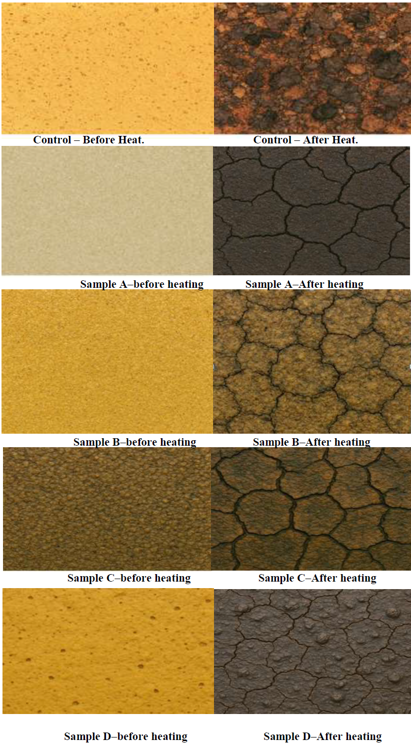 Post-combustion surface morphology was examined using optical microscopy (Figure 11), which showed that uncoated steel suffered severe oxidation and scaling, whereas coated samples developed intact char layers with minimal cracks. Sample B displayed the most uniform and compact surface morphology, reflecting effective interaction among starch, lignin, and bentonite nanoparticles. The dense and continuous char supports the enhanced flame resistance reported in Table 6. In contrast, Samples A and D exhibited minor voids and discontinuities, indicating weaker interfacial adhesion and less cohesive char formation. These observations demonstrate that the clay–lignin synergy in Sample B effectively reduces gas permeability, enhances structural integrity during combustion, and supports improved flame-retardant performance.