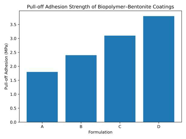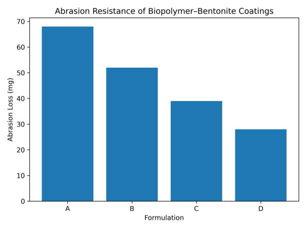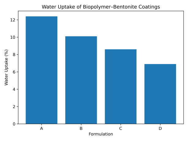 The coating performance properties of the biopolymer–bentonite formulations are summarized in Table 7. The pull-off adhesion strength increases progressively with the addition of bentonite nanoparticles, indicating improved mechanical interlocking and interfacial bonding between the coating and substrate. Similarly, abrasion resistance improves significantly as the inorganic clay reinforcement enhances the structural stability of the coating matrix. Surface wettability measurements reveal an increase in water contact angle with increasing bentonite content, suggesting improved moisture resistance of the coating. The reduced water uptake values further demonstrate that the incorporation of bentonite nanoparticles enhances the barrier properties and durability of the coating system. The adhesion strength increases with increasing bentonite content, indicating improved interfacial bonding between the coating and substrate (Figure 12). The incorporation of bentonite significantly reduces abrasion loss, demonstrating improved mechanical durability (Figure 13). The increase in contact angle indicates enhanced surface hydrophobicity with the addition of bentonite nanoparticles (Figure 14). The reduced water absorption observed for the modified formulations suggests improved barrier properties (Figure 15).