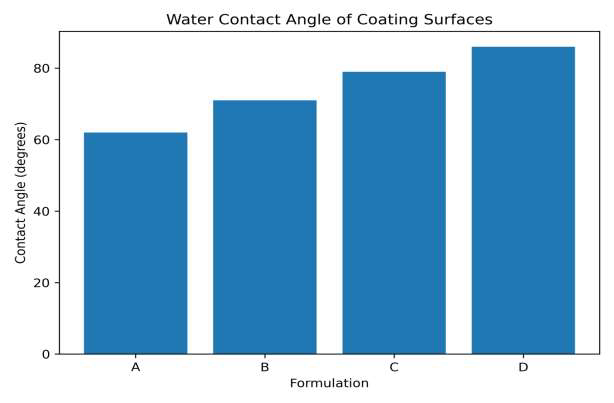 Adhesion strength was determined using a pull-off test (ASTM D4541), where aluminum dollies bonded to the coating were subjected to perpendicular tensile force until failure, and the maximum stress was recorded. Cross-hatch adhesion was assessed following ASTM D3359 by creating a lattice pattern on the coating surface and rating adhesion from 0B (poor adhesion) to 5B (excellent adhesion) using tape removal. Abrasion resistance was evaluated with a Taber abrasion tester under controlled loading, with weight loss used as an indicator of durability. Surface wettability was measured using a contact angle goniometer by placing a water droplet on the coating to determine hydrophobicity. Water absorption of the coatings was evaluated by immersing coated samples in distilled water at room temperature for a fixed period. The samples were weighed before and after immersion, and water uptake was calculated using the percentage mass increase.