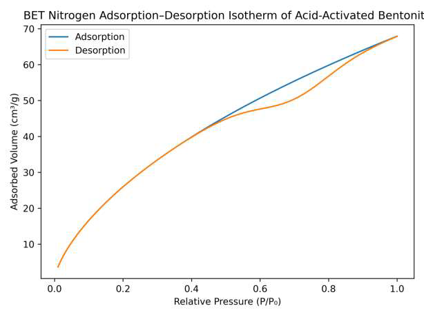The nitrogen adsorption–desorption isotherm of acid-activated bentonite is presented in Figure 16. The isotherm displays a Type IV curve with a hysteresis loop, characteristic of mesoporous materials, indicating that acid activation increased the pore volume and specific surface area of the clay. This enhanced porosity facilitates stronger interfacial interactions between bentonite nanoparticles and the biopolymer matrix, promoting better dispersion and contributing to improved fire-retardant performance of the coatings (Figure 16). The isotherm exhibits a Type IV curve with a hysteresis loop, indicating the presence of mesoporous structures formed after acid activation of the clay.