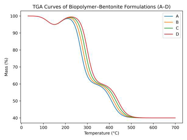 Thermogravimetric analysis (TGA) of the biopolymer–bentonite coatings (A–D) revealed a three-stage decomposition pattern (Figure 2). The first stage (25–120 \(^{\circ}\)C) corresponds to moisture loss, accounting for \(\sim\)10% of total weight reduction. The second stage (250–350 \(^{\circ}\)C) involves biopolymer decomposition, primarily due to starch depolymerization and lignin side-chain breakdown. The final stage (350–550 \(^{\circ}\)C) reflects char formation, producing a stable carbonaceous residue [21, 22].