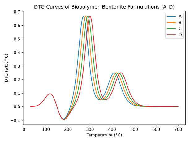 Derivative TGA (DTG) curves (Figure 3) show that the maximum degradation rate temperature (T\(_{\max}\)) shifts to higher values in bentonite- and borate-modified formulations, further confirming improved thermal stability. The increase in residual char formation suggests that bentonite nanoparticles act as a thermally stable barrier, restricting oxygen and volatile gas diffusion during decomposition, consistent with previously reported hybrid bio-coatings [26].