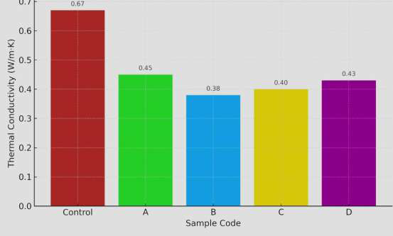 Thermal conductivity measurements were conducted using a guarded hot plate (Lee’s disc) under steady-state conditions. Mild-steel panels (100 mm \(\times\) 100 mm) were coated with a uniform 0.5 \(\pm\) 0.05 mm layer of the biopolymer-based coating. Both faces of each specimen were maintained in thermal contact with guard heaters, and temperatures were monitored using calibrated thermocouples. The system was calibrated with reference metals of known thermal conductivity to ensure accuracy. Steady state was confirmed by monitoring heat flux and temperature differences for at least 30 minutes until variations were \(<1\)%. To minimize contact resistance, surfaces were polished, a thin layer of thermal grease applied, and uniform clamping used; residual contact resistance was estimated from measurements of uncoated control panels. All measurements were performed in triplicate (\(n=3\)) for each sample, and results were reported as mean \(\pm\) standard deviation. This methodology ensures that the reported k\(_{\text{eff}}\) captures the combined effect of the coating and substrate, allowing reproducible and meaningful comparisons across samples.