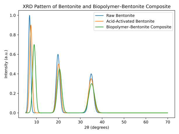 XRD patterns confirmed that bentonite retained its montmorillonite layered structure, with characteristic basal reflections (d\(_{001}\)) at 2\(\theta \approx 5.8\)–8\(^{\circ}\), and additional peaks at 19.7\(^{\circ}\) and 35\(^{\circ}\) (Figure 7). Acid activation caused a slight increase in basal spacing from 1.50 nm to 1.56 nm, indicating partial intercalation and surface modification of the clay layers. Incorporation of bentonite into the biopolymer matrix further broadened and shifted the basal peak toward higher diffraction angles, consistent with polymer intercalation and partial exfoliation of the clay layers. These structural changes enhance nanoparticle dispersion, increase surface activity, and improve the thermal stability and flame-retardant performance of the composite coating.