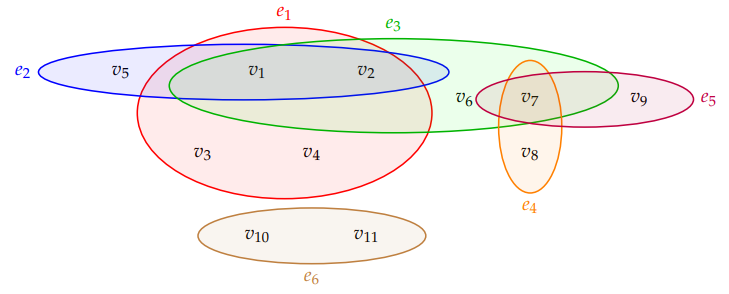 Definition 1. A hypergraph \(\mathcal{H}\) is a pair \(\mathcal{H}(V, E)\) where \(V\) is a finite nonempty set and \(E\) is a collection of subsets of \(V\). The elements of \(V\) are called vertices and the elements of \(E\) are called edges or hyperedges. And \(\displaystyle \cup_{e_i\in E}{e_i}=V\) and \({e_i \neq \phi}\) are required for all \({e_i \in E}.\) The number of vertices in \(\mathcal{H}\) is called the order of the hypergraph and is denoted by \(|V|\). The number of edges in \(\mathcal{H}\) is called the size of \(\mathcal{H}\) and is denoted by \(|E|\). A hypergraph of order \(n\) and size \(m\) is called a \((n, m)\) hypergraph. The number \(|{e_i}|\) is called the degree (cardinality) of the edges \({e_i}\). The rank of a hypergraph \(\mathcal{H}\) is \(\displaystyle r(\mathcal{H})= max_{e_i \in E}{|e_i|}\).