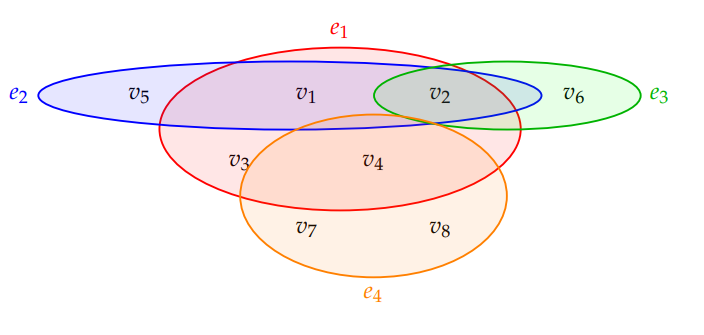 Definition 5. For any hypergraph \(\mathcal{H}(V, E)\) two edges are said to be adjacent if their intersection is nonempty. If a vertex \(v_i \in V\) belongs to an edge \(e_j\in E\) then we say that they are incident to each other.