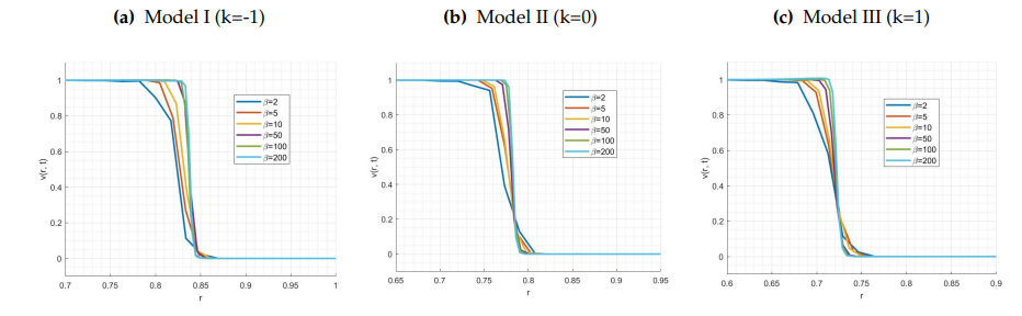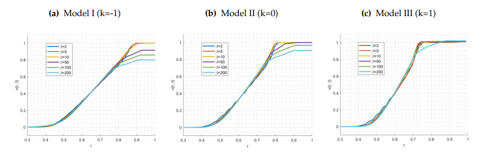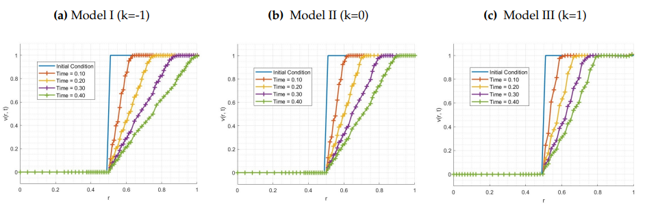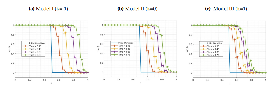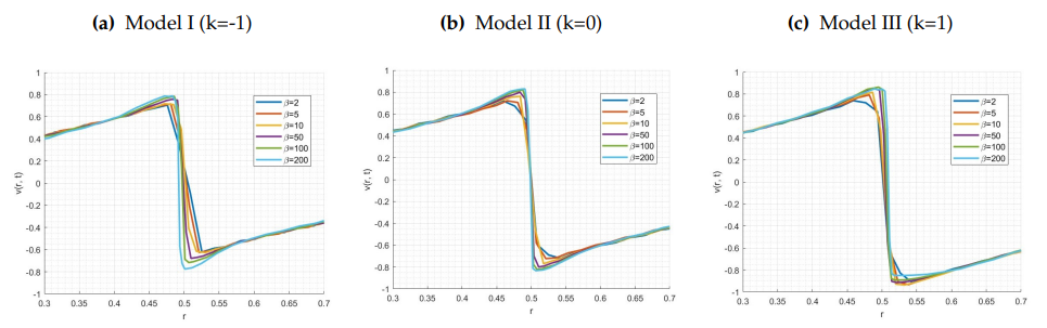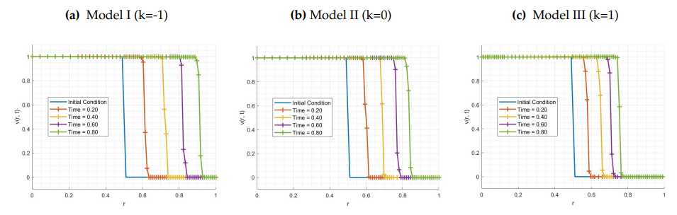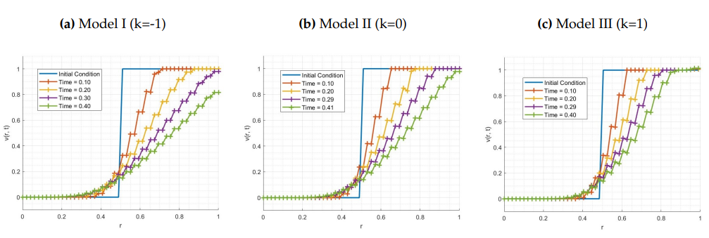 The numerical solution \(\tilde{v}\) at the adapted mesh points \(\tilde{r}_{j+\frac{1}{2}}\) is computed based on the solution values \(v_j\) on the original mesh and the corresponding mesh locations \(r_{j+\frac{1}{2}}\), thereby ensuring a consistent transfer of information between the old and new meshes. In the actual computation, the linear flux \(c\nu\) is approximated by \[\label{Con-3.0} (cv)_{j+\frac{1}{2}} = \frac{c_{j+\frac{1}{2}}}{2} \left( v_{j+\frac{1}{2}}^+ + v_{j+\frac{1}{2}}^- \right) – \frac{|c_{j+\frac{1}{2}}|}{2} \left( v_{j+\frac{1}{2}}^+ – v_{j+\frac{1}{2}}^- \right), \tag{26}\] where \(v_{j+\frac{1}{2}}^+\) and \(v_{j+\frac{1}{2}}^-\) denote the reconstructed values of \(v\) at the interface \(r_{j+\frac{1}{2}}\) from the right and left sides, respectively. These are approximated using the MUSCL-type reconstructions given in (18)–(20).