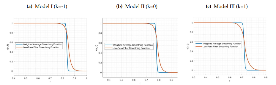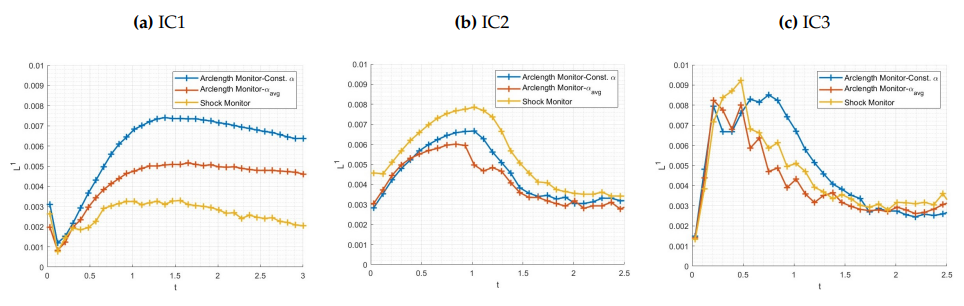 Our study integrates the method described by [7] with various smoothing and monitor functions present in the literature. A set of three monitor functions is selected to be investigated: arc length (28), solution-dependent arc length (29) and shock monitor (30), combined with low-pass (31) or weighted average (32) smoothing functions.