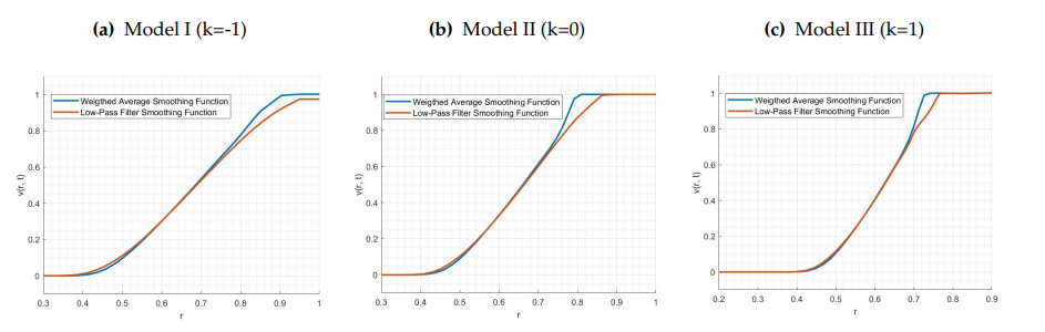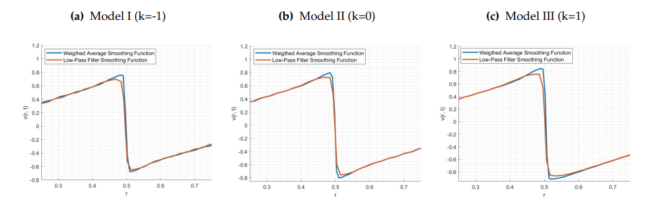 The smoothing procedures are applied iteratively after each update of the monitor function to maintain mesh regularity and prevent grid irregularities. The low-pass filter method (31), used in [7] and [8], has been shown to produce smooth meshes effectively. In contrast, the weighted average smoothing technique (32), proposed in [5], provides a more localized and adaptive smoothing effect. In this study, both methods are systematically evaluated, and, as shown in Section 4, the weighted average smoothing consistently yields superior results across a range of numerical experiments for the Burgers–FLRW models.