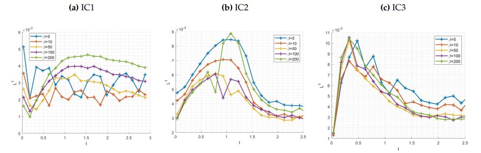 The shock monitor requires tuning of the constant \(\beta\), which controls shock and rarefaction resolution. Figures 9–11 illustrate the results of numerical experiments conducted to determine the optimal value of \(\beta\) for initial conditions IC1–IC3, corresponding to final times of \(t = 0.6\), \(0.3\), and \(0.45\), respectively. Results indicate that for IC1, increasing \(\beta\) sharpens discontinuities, where optimal interval is \(10 \le \beta \le 50\). For IC2, smaller \(\beta\) values (\(2 < \beta < 10\)) are better for rarefaction resolution. Finally, for IC3, a value of \(\beta = 50\) is found to optimally capture discontinuities while avoiding excessive refinement. Across all cases, the shock monitor performs most effectively within \(\beta \in [10, 50]\).