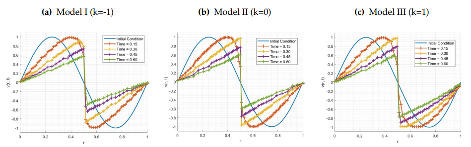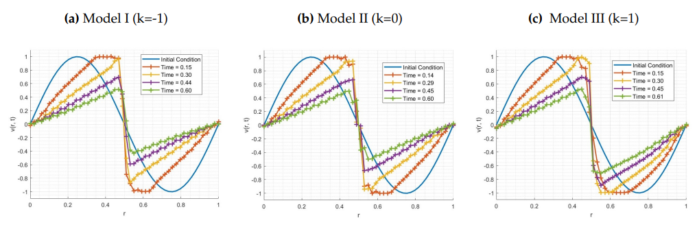 Our numerical experiments begin with finite volume discretizations of the models (6)–(8) on a fixed uniform mesh. The aim of this chapter is to observe the behavior of models in their simplest form using three different initial conditions, which is necessary to understand the development of shock and rarefaction waves over time.