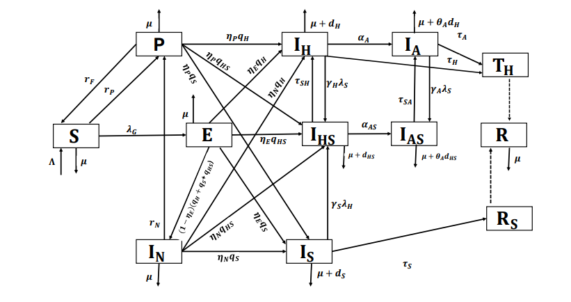 The mathematical model for HIV-syphilis coinfection including the PrEP program and its effect on the diagnosis of infected individuals is: \[ \dfrac{dS}{dt} =\, \Lambda +r_{F} P-(\mu+r_{P}+\lambda_{G}) S, \label{eq1}\ \tag{8}\] \[\dfrac{dP}{dt} =\, r_{P}S+ r_{N}I_{N}-(\mu+r_{F}+\lambda_{S}+\eta_{p}(q_{H}+q_{S}+q_{HS})) P, \ \tag{9}\] \[\dfrac{dE}{dt} =\, \lambda_{G} S- (\mu+q_{H}+q_{S}+q_{HS})E, \ \tag{10}\] \[\dfrac{dI_{N}}{dt} =\, (1-\eta_{E})(q_{H}+q_{S}+q_{HS})E-(\mu+r_{N}+\eta_{N}(q_{H} +q_{S}+q_{HS}))I_{N}, \ \tag{11}\] \[\dfrac{d I_{H}}{dt} =\, (\eta_{E}E+\eta_{p}P+\eta_{N}I_{N})q_{H}+\tau_{SH}I_{HS} -(\mu+d_{H}+\alpha_{A}+\tau_{H}+\gamma_{H}\lambda_{S})I_{H}, \ \tag{12}\] \[\dfrac{d I_{A}}{dt} =\, \alpha_{A}I_{H}+\tau_{SA}I_{AS}- (\mu+\theta_{A}d_{H}+\gamma_{A}\lambda_{S}+\tau_{A})I_{A}, \ \tag{13}\] \[\dfrac{dI_{S}}{dt} =\, (\eta_{E}E+\eta_{p}P+ \eta_{N}I_{N})q_{S}+\lambda_{S}P- (\mu+\tau_{S}+\gamma_{S}\lambda_{H} +d_{S})I_{S}, \ \tag{14}\] \[\dfrac{dI_{HS}}{dt} =\, (\eta_{E}E+\eta_{P}P+ \eta_{N}I_{N})q_{HS}+\gamma_{H}\lambda_{S}I_{H} + \gamma_{S}\lambda_{H}I_{S} – (\mu+d_{HS}+\tau_{SH}+\alpha_{AS})I_{HS}, \ \tag{15}\] \[\dfrac{dI_{AS}}{dt} =\, \alpha_{AS}I_{HS}+\gamma_{A}\lambda_{S}I_{A}-(\mu+\theta_{A}d_{HS}+\tau_{SA})I_{AS}, \ \tag{16}\] \[\dfrac{dR}{dt} =\, \tau_{S}I_{S}+\tau_{H}I_{H}+\tau_{A}I_{A}-\mu R, \label{eq2} \tag{17}\] with initial conditions: \(S(0)>0, \quad E(0)>0, \quad P(0)>0, \quad I_{N}(0)>0 \quad I_{H}(0)>0, \quad I_{A}(0)>0, \quad I_{S}(0)>0, \quad I_{HS}(0)>0, \quad I_{AS}(0)>0, \quad \text{and}\;\; R(0)>0\).