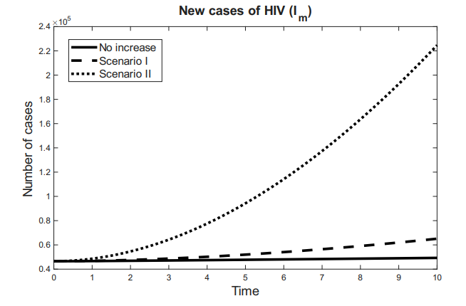Using the model construction, the new cases of HIV, syphilis, and their coinfection are represented by the following differential equations: \[ \dfrac{d I_{n}}{dt} =(\eta_{E}E+\eta_{p}P+\eta_{N}I_{N})q_{H}, \label{eq11}\ \tag{18}\] \[\dfrac{d I_{m}}{dt} =(\eta_{E}E+\eta_{p}P+\eta_{N}I_{N})q_{S}+\lambda_{S}P, \label{eq12}\ \tag{19}\] \[\dfrac{d I_{nm}}{dt} = (\eta_{E}+\eta_{p}+\eta_{N}I_{N})q_{HS}+ \gamma_{H}\lambda_{S}H+ \gamma_{S}\lambda_{H}I_{S}. \label{eq13} \tag{20}\]