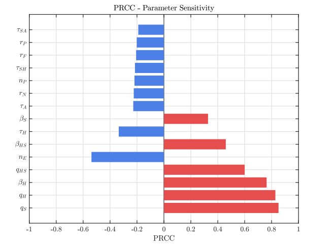 Parameters \(q_{S}\) and \(q_{H}\) have a positive effect and are among the most influential for their respective diseases, suggesting that an increase in these parameters leads to a rise in transmission. However, when analyzing the coinfection dynamics, the opposite effect is observed (a negative impact). In this case, we are dealing with three possible dynamics and transmission routes within a single system — HIV, syphilis, and their coinfection — along with their respective treatments and diagnostic processes.