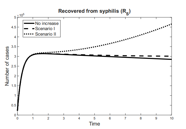 Several studies have examined the relationship between HIV pre-exposure prophylaxis (PrEP) and syphilis transmission dynamics using mathematical modeling and epidemiological simulations. Pedrosa et al. [22] investigated the incidence and risk factors of acquired syphilis among HIV PrEP users in Brazil using a retrospective cohort design and multivariate analysis. They reported 19.1 cases per 100 person-years, identifying risk factors such as prior syphilis, irregular condom use, transactional sex, and recreational drug use, while female gender and certain racial groups were protective. The study highlights the importance of monitoring PrEP users with targeted prevention strategies and regular syphilis screening. Nguyen et al. [23] examined the association between sociodemographic factors, HBV and HCV infection, and syphilis among HIV PrEP users in Vietnam using a cross-sectional survey and logistic regression analysis. They found that male gender, being employed, and HBV infection were significantly associated with higher syphilis risk. The study underscores the need for targeted STI prevention and monitoring strategies within PrEP programs. Mendoça et al. [24] conducted an ecological study in Brazilian state capitals from 2018 to 2022 to examine the association between HIV PrEP administration, STI incidence, and socioeconomic indicators. They found that PrEP use was significantly correlated with syphilis and viral hepatitis incidences, as well as with social determinants such as illiteracy, income, and sanitation, highlighting regional disparities. The study emphasizes the importance of integrating social determinants into PrEP programs to improve access and reduce STI risk in vulnerable populations.