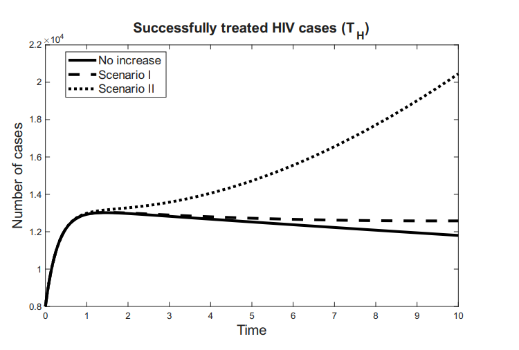 We can conclude that increasing PrEP use in the population and reducing the rate of PrEP discontinuation or failure leads to a greater number of diagnosed cases of syphilis, HIV, and HIV-syphilis coinfection. This is a positive outcome, as these individuals are indeed infected and part of the transmission dynamics, meaning they can spread the diseases if undiagnosed (see Figures 18-20). Diagnosis plays a crucial role, as it enables appropriate treatment: syphilis can be cured, and in the case of HIV, antiretroviral therapy prevents progression to AIDS and leads to undetectable viral loads in the blood, thereby preventing further transmission.