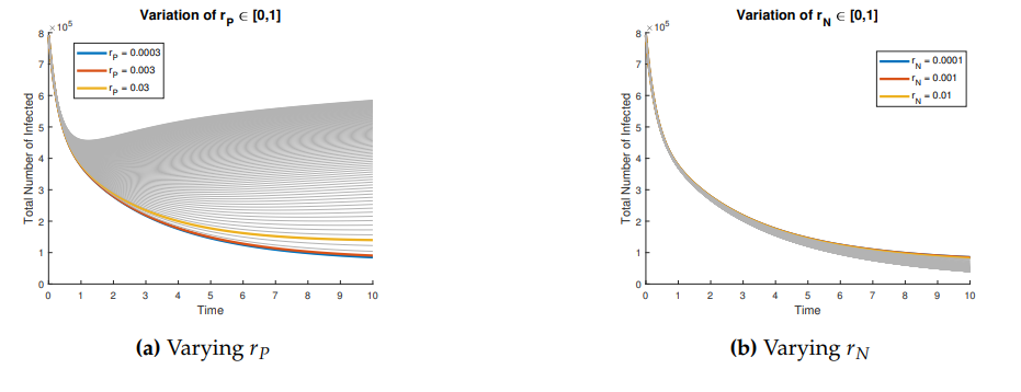 Now, we study \(r_n\), which is the rate at which infected individuals who are undiagnosed or unaware of their status attempt to enter the PrEP program, in combination with \(\eta_p\). Here, we observe behavior analogous to that seen in the study of variation with \(r_p\) (see Figures 12–14). The behavior observed in the variation of \(r_n\) with \(\eta_{P}\) is analogous to that of the variation of \(r_p\) with \(\eta_{P}\) (see Figures 15-17). Therefore, we can conclude that \(r_n\) also has a strong influence on the dynamics.