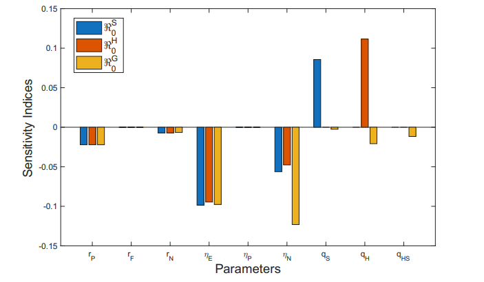 Figure 5 graphically displays the sensitivity indices of each parameter with respect to the basic reproduction numbers.