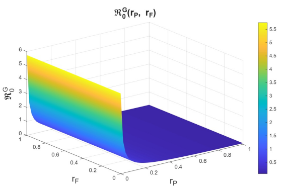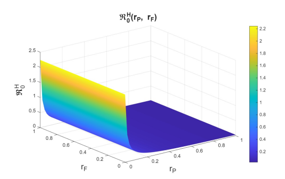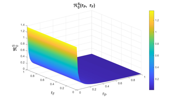 First, we examine the joint variation of \(r_p\) and \(r_f\), as the combination of these parameters determines entry into the PrEP program and exit due to various causes. Figures 6–8 show the variation of these parameters on the basic reproduction numbers. For the different basic reproduction numbers associated with the dynamics of syphilis, HIV, and HIV–syphilis coinfection, we observe analogous behavior: when \(r_p\) decreases, the basic reproduction numbers exceed one. However, when \(r_p\) increases, the basic reproduction numbers decrease significantly, reaching values well below one, which is a positive effect.