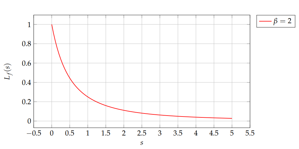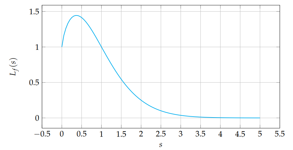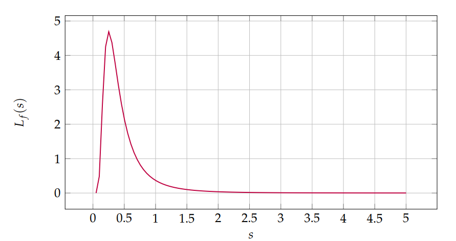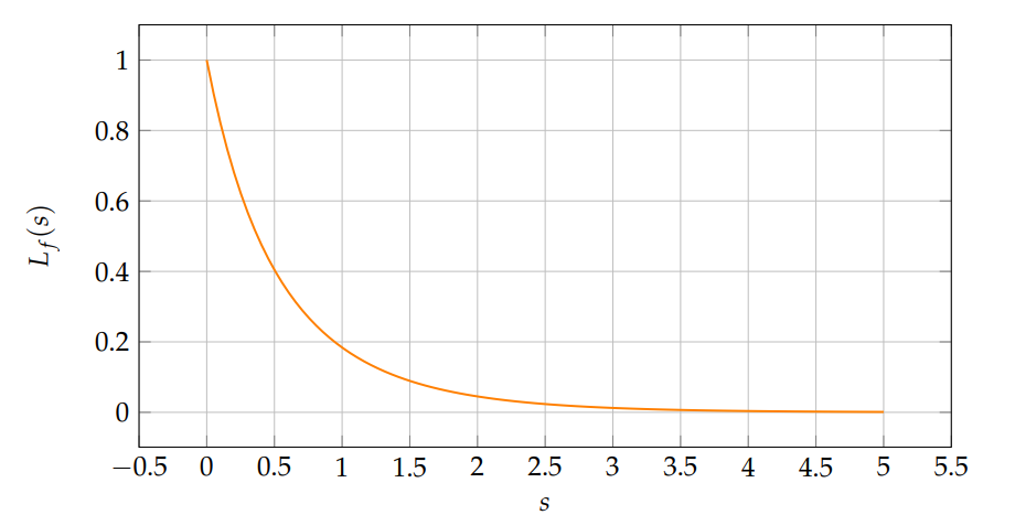 Let \(\beta=2\), \(\lambda=1\), then \(L_f(s)=(1/(1+s))^2\). Figure 2 shows the transform.