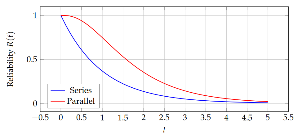 \(\circ\) Parallel system: system fails if all components fail. \[R_{parallel}(t) = 1 – \prod_{i=1}^n (1-R_i(t)).\]
